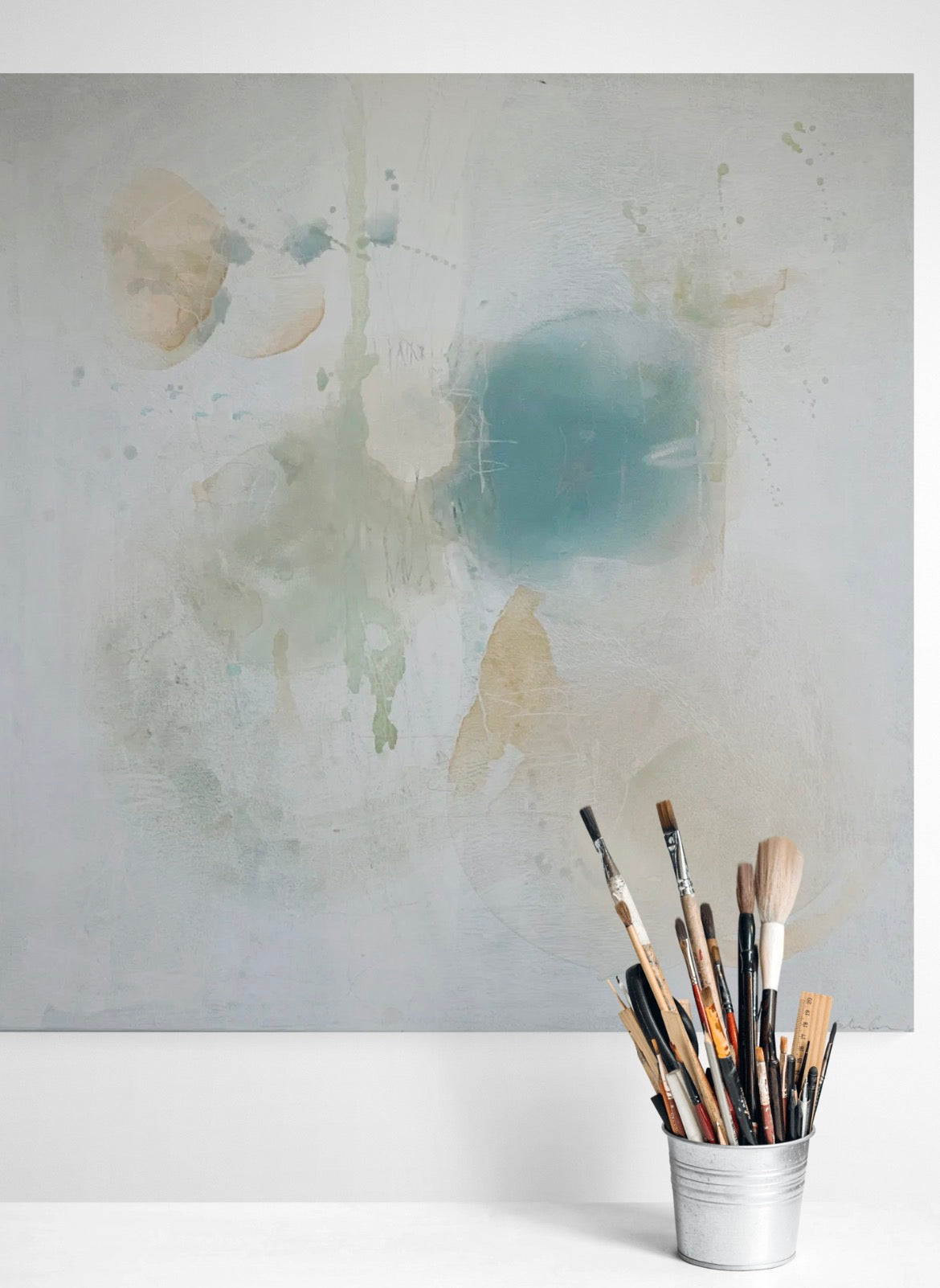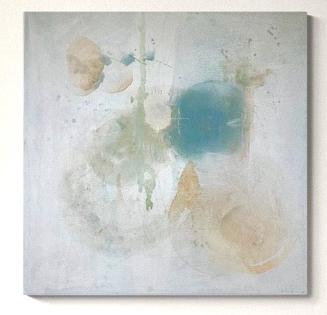 Soft, layered washes of blue, gray, and warm neutrals create a quiet, atmospheric field that feels both grounding and expansive. Subtle textures and organic marks drift across the surface, inviting stillness and reflection without demanding interpretation.