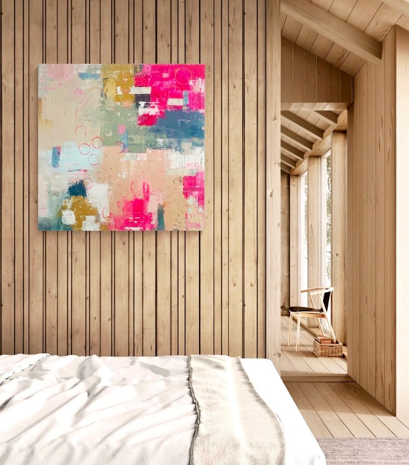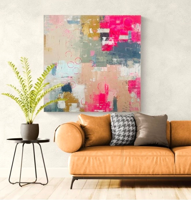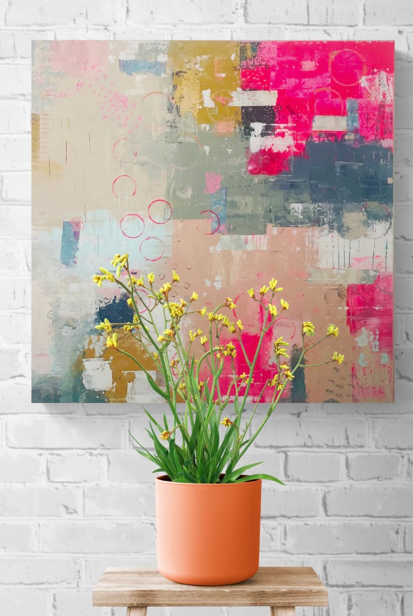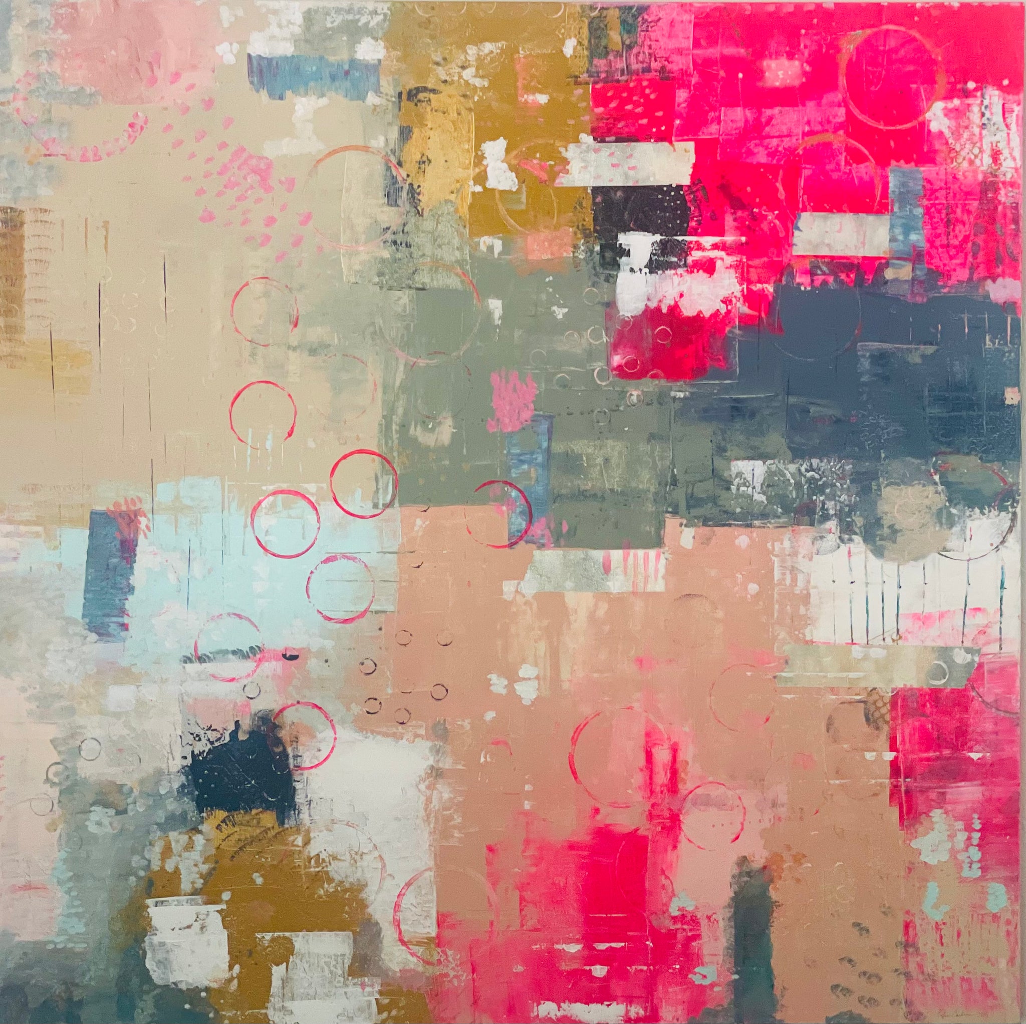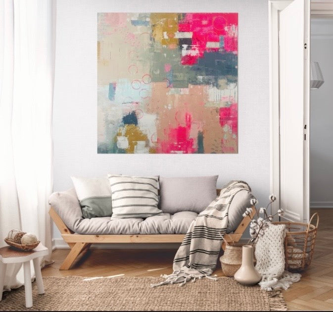 Fiona is an abstract meditation on intuition, memory, and the quiet moments that ask to be remembered. Built through layered fields of soft neutrals, muted greens, warm blush tones, and punctuations of vivid pink, the composition feels both grounded and energetic—like a fleeting thought suspended in time. Subtle markings, circular motifs, and textured passages invite closer inspection, revealing traces of movement, revision, and discovery beneath the surface.