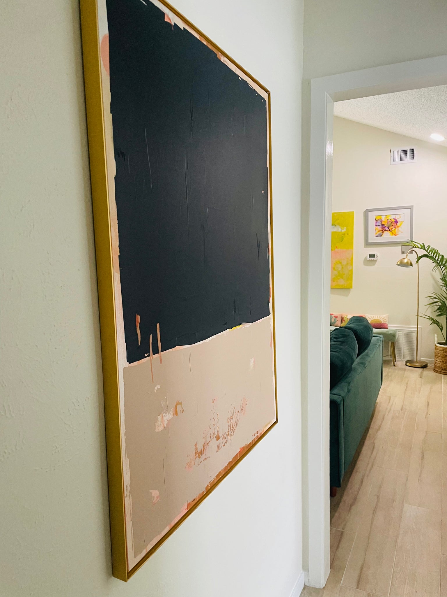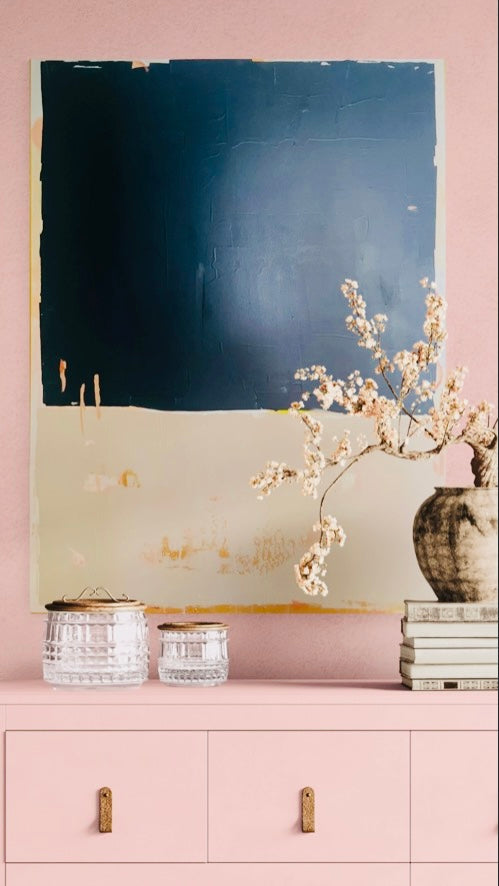 Rooted explores the quiet strength found in stillness and grounding. The deep indigo upper plane contrasts with a soft, earthy base, evoking the duality of depth and lightness — a visual reflection of resilience and surrender. Subtle texture and layered color reveal traces of imperfection, reminding us that growth begins beneath the surface.