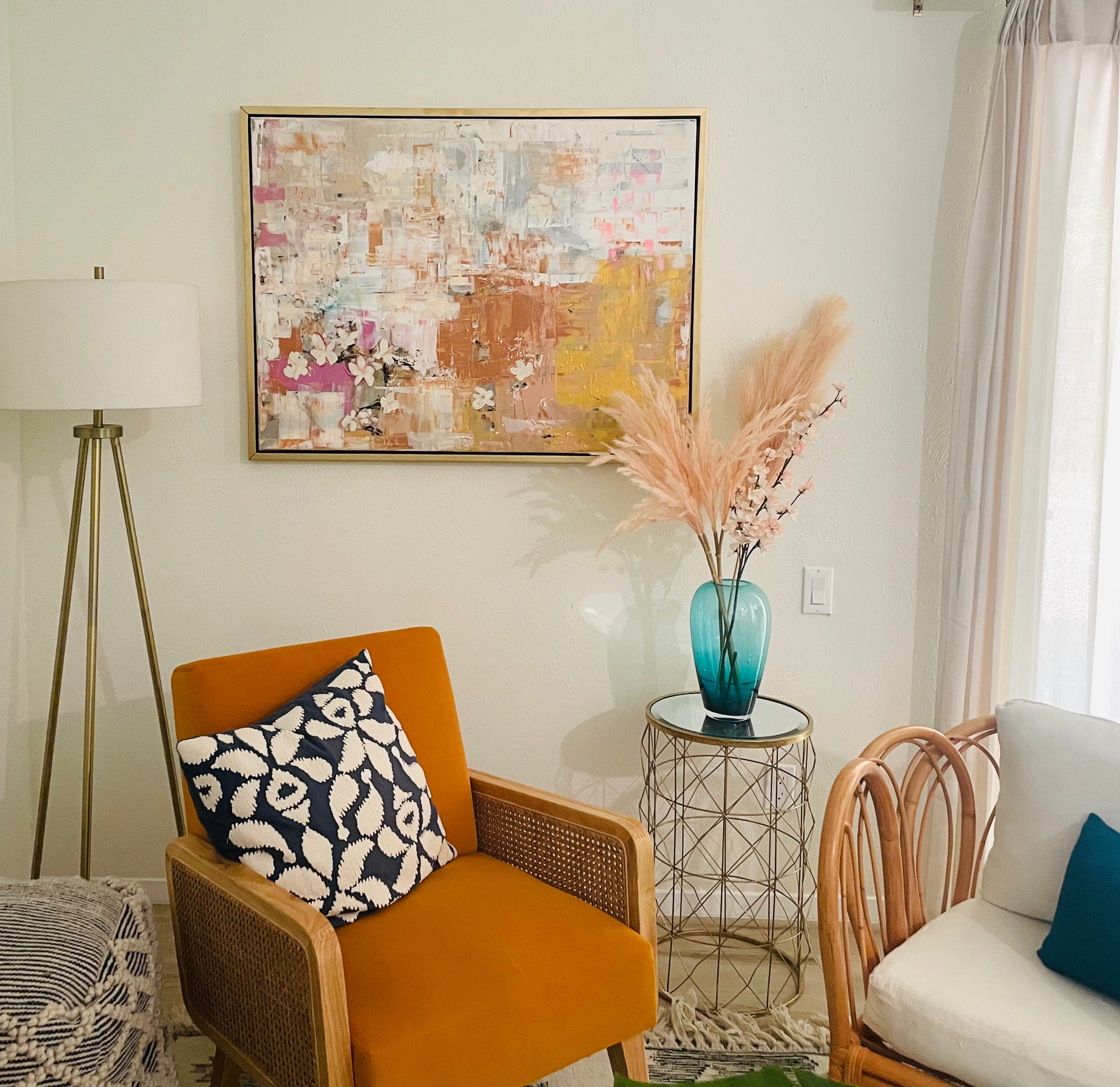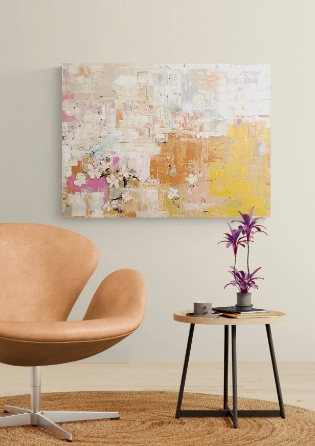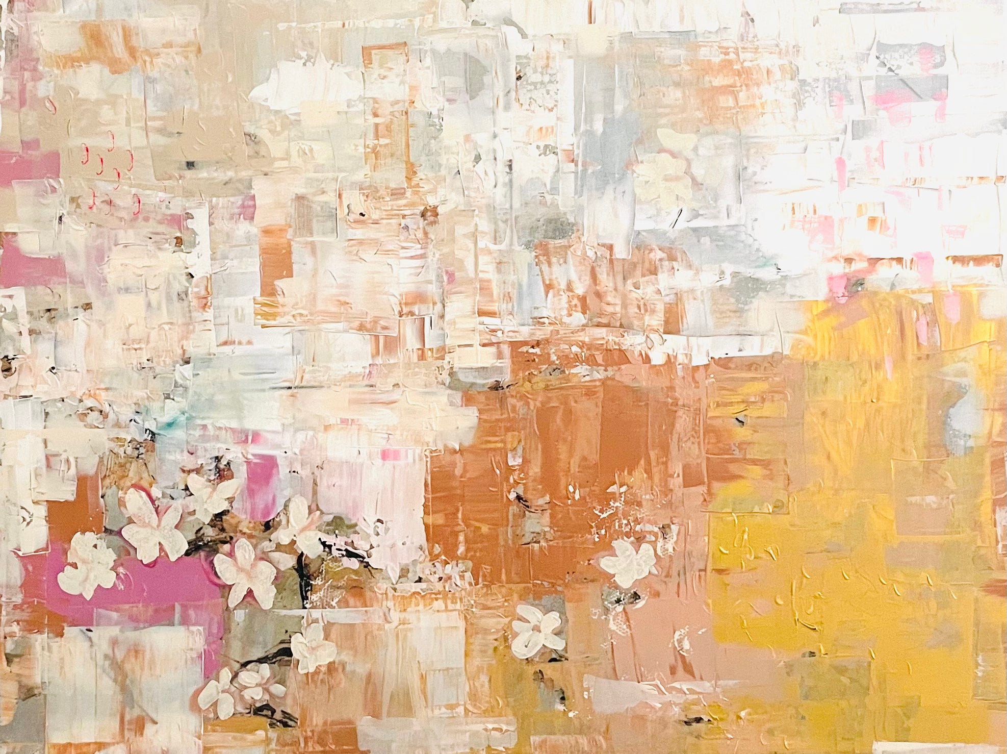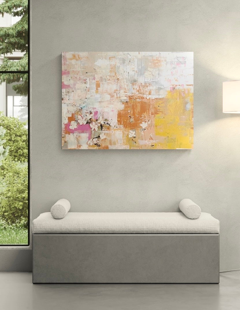 Soften In carries a quiet sense of history and renewal. Layers of warm creams, pale blush, soft ochres, and sunlit yellows settle into one another, with subtle textures and gentle forms emerging and fading across the surface. The work reflects a moment of easing—where edges blur, expectations loosen, and space opens for gentleness, reflection, and renewal.