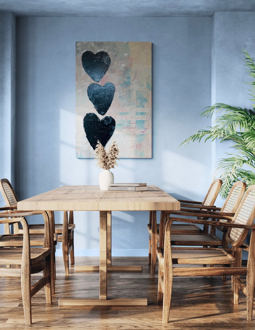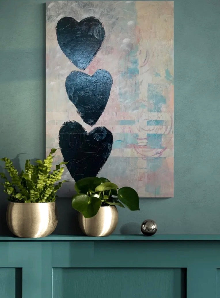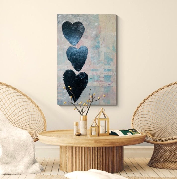 This original painting features three dark, textured hearts stacked vertically against a softly layered background. The restrained palette and subtle surface marks evoke emotional weight, repetition, and quiet endurance. What Remains reflects on what lingers after movement, change, or loss—what stays held, even in stillness.