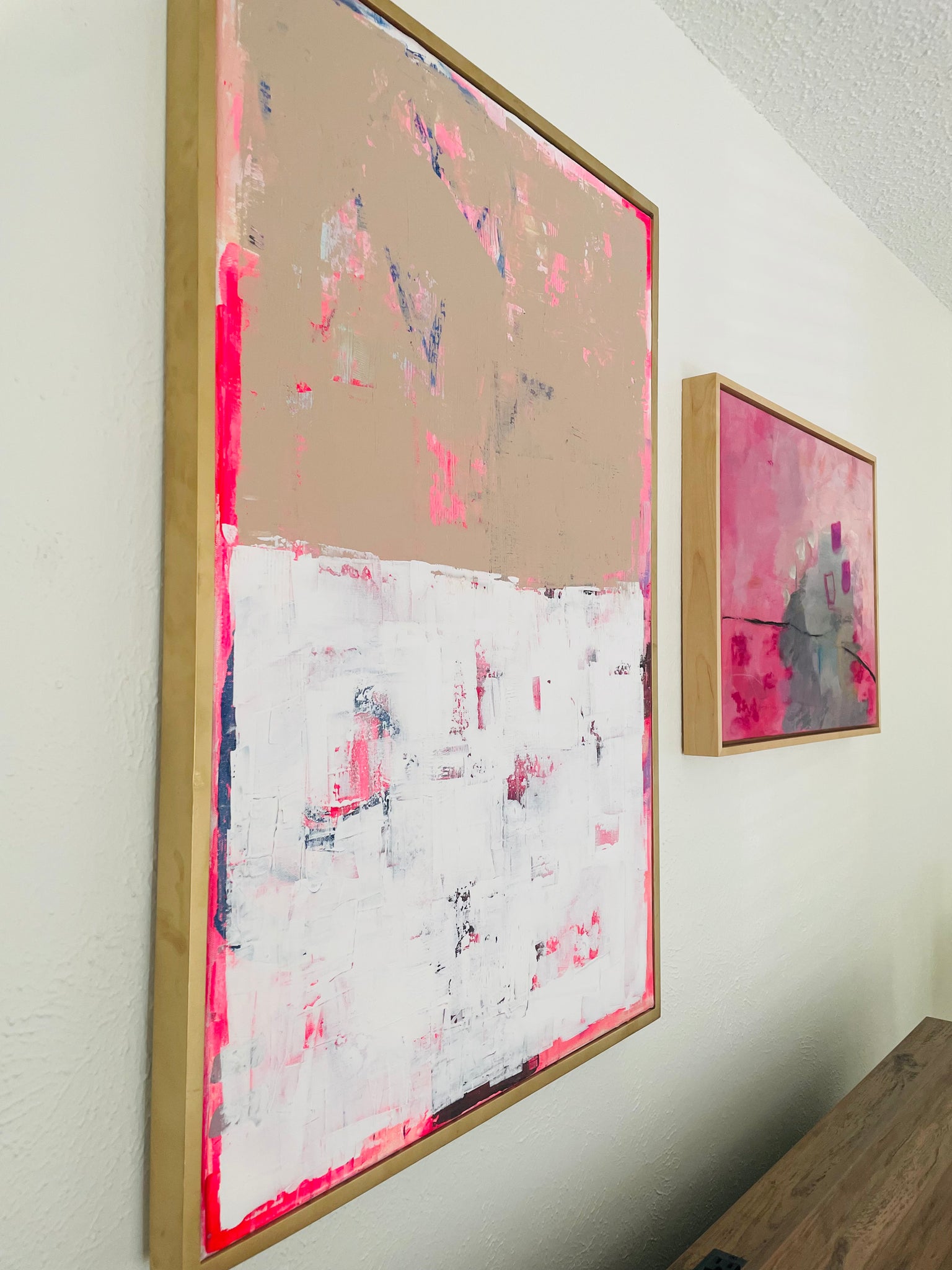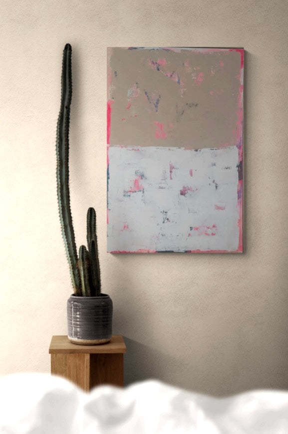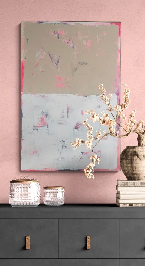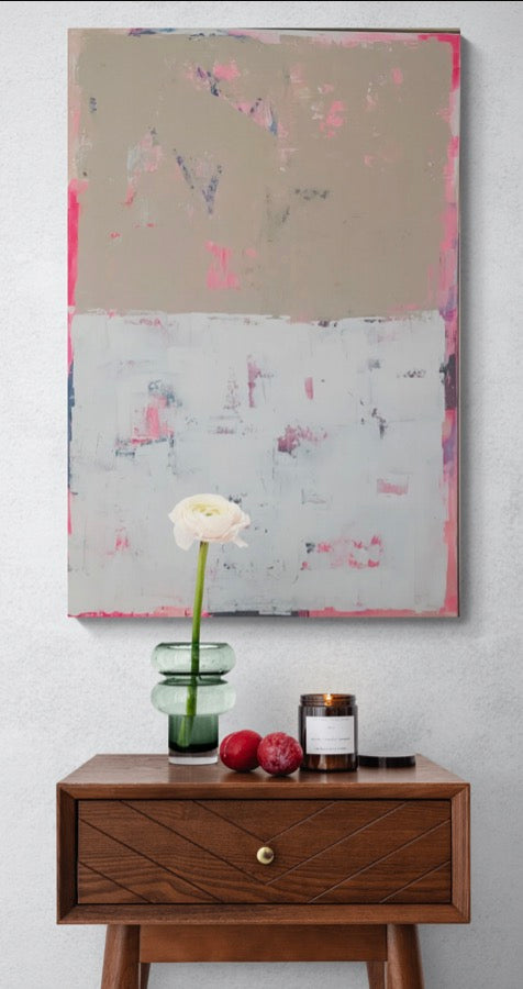 “Behind My Heart” reflects the quiet tension between vulnerability and composure. Soft neutrals and traces of pink emerge through layered texture, suggesting emotions held just beneath the surface. The blend of acrylic and oil pastels creates depth and transparency, inviting reflection on what remains unseen.